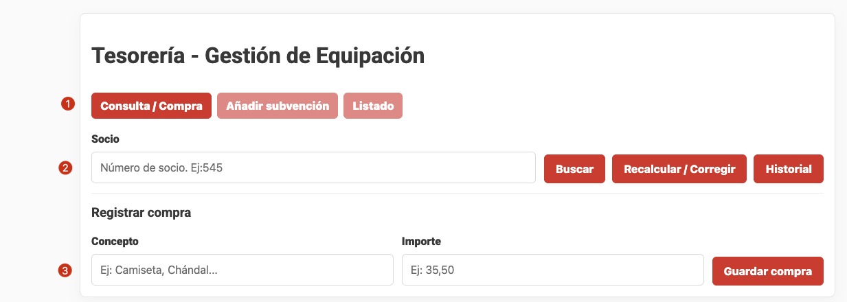 Esta sección sólo está disponible para los usuarios relacionados con tesorería y sirve para gestionar las subvenciones relacionadas con la compra de equipación oficial del club.