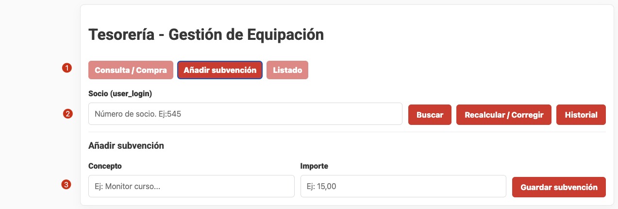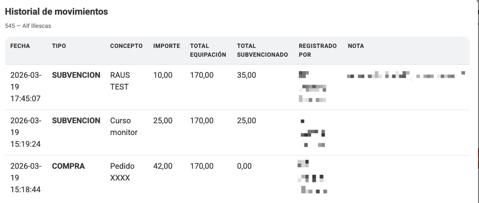 Para que el sistema pueda tener en cuenta el importe invertido por el socio en la compra de equipación, es necesario añadir dicho importe desde este apartado. Además, desde aquí se podrán gestionar otras subvenciones de forma manual, así como consultar el histórico de movimiento de cada socio.