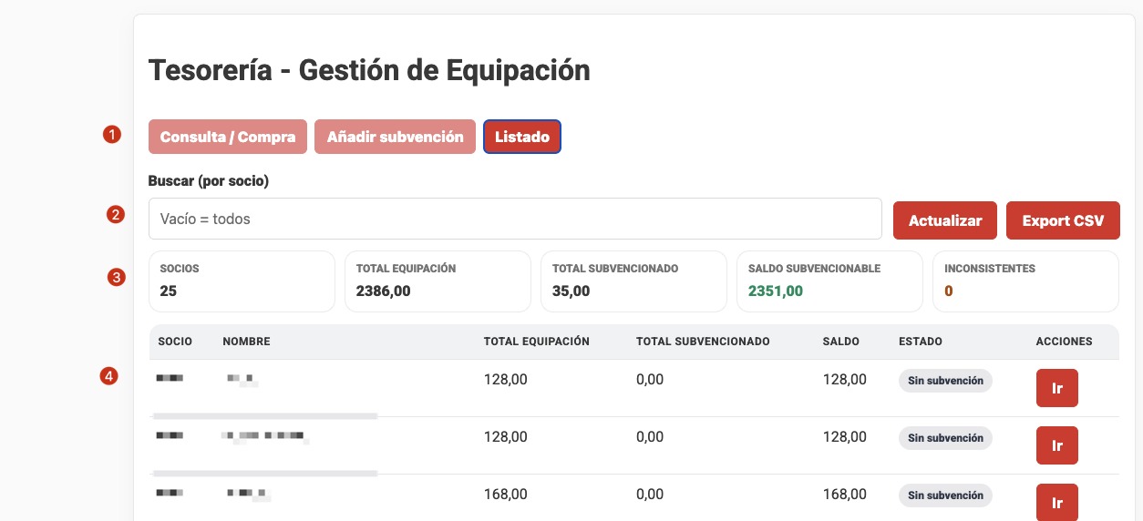 - Aquí vemos un resumen de los socios que han adquirido la equipación oficial, el importe total ingresado para la compra de equipación, el total subvencionado, el saldo subvencionable y el numero de entradas inconsistentes (con un importe subvencionado superior al importe invertido).