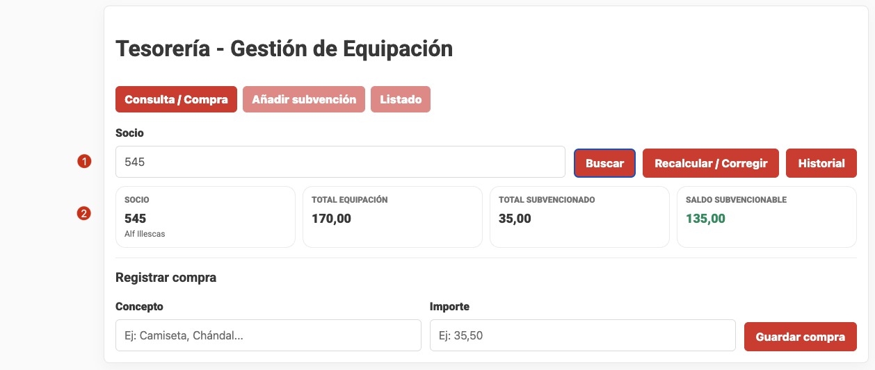 Si este socio además hubiese adquirido una nueva equipación susceptible de ser subvencionada, podríamos introducir el concepto, por ejemplo, “equipación completa” y el importe “128”. Al pulsar en Guardar compra, se actualizarían los campos de total equipación y saldo subvencionable.